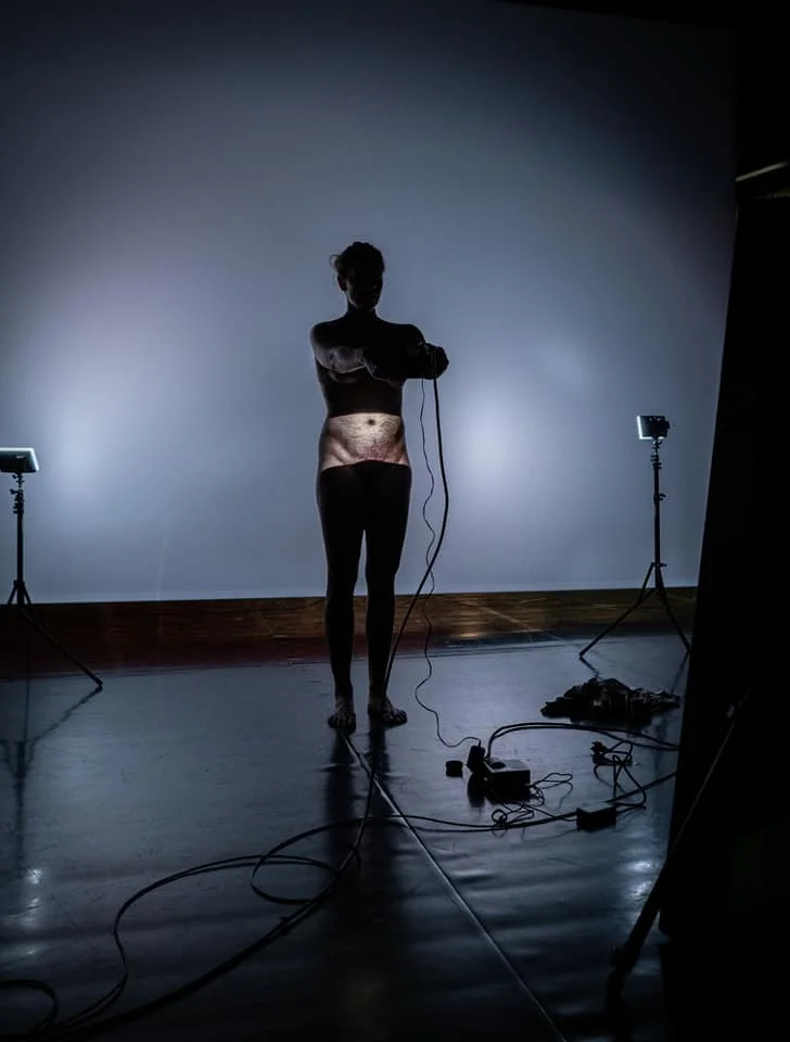 Using a video (live) stream, the performer conducts a self exploration of her body on stage.