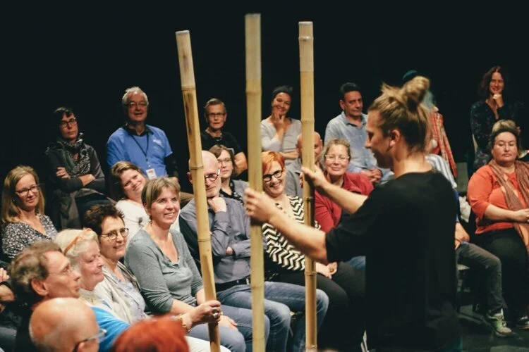 In an intimate circular setting the performer moves, balances and drops bamboo sticks. He plays with the natural reactions of the audience in a simple and smart way, manipulating not only his Bamboo sticks but also their focus and attention.