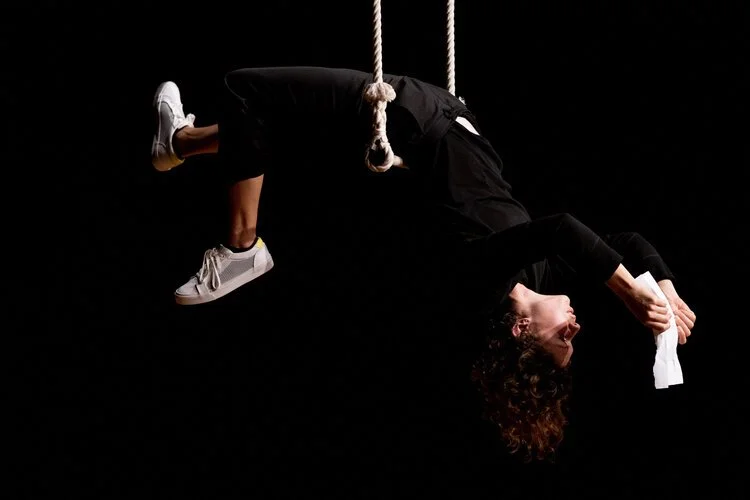 Questions to the Endless asks questions, makes you reflect about yourself, about the world, and about the mystery of the trapeze. In this project Laurence Felber combines circus, visual arts and spoken language in different formats, such as live performance, exhibited posters and an interactive performance.