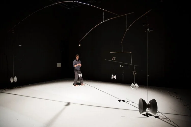 A confrontation with a 40kg pendulum made of concrete. Something massive that can be manipulated. Seemingly dead, it can be brought to life. It's a play with power, through anxiety, respect and joy. A reciprocal and ever intensifying exploration of movements, perceptions and emotions. Always on the research of the perfect imbalance.